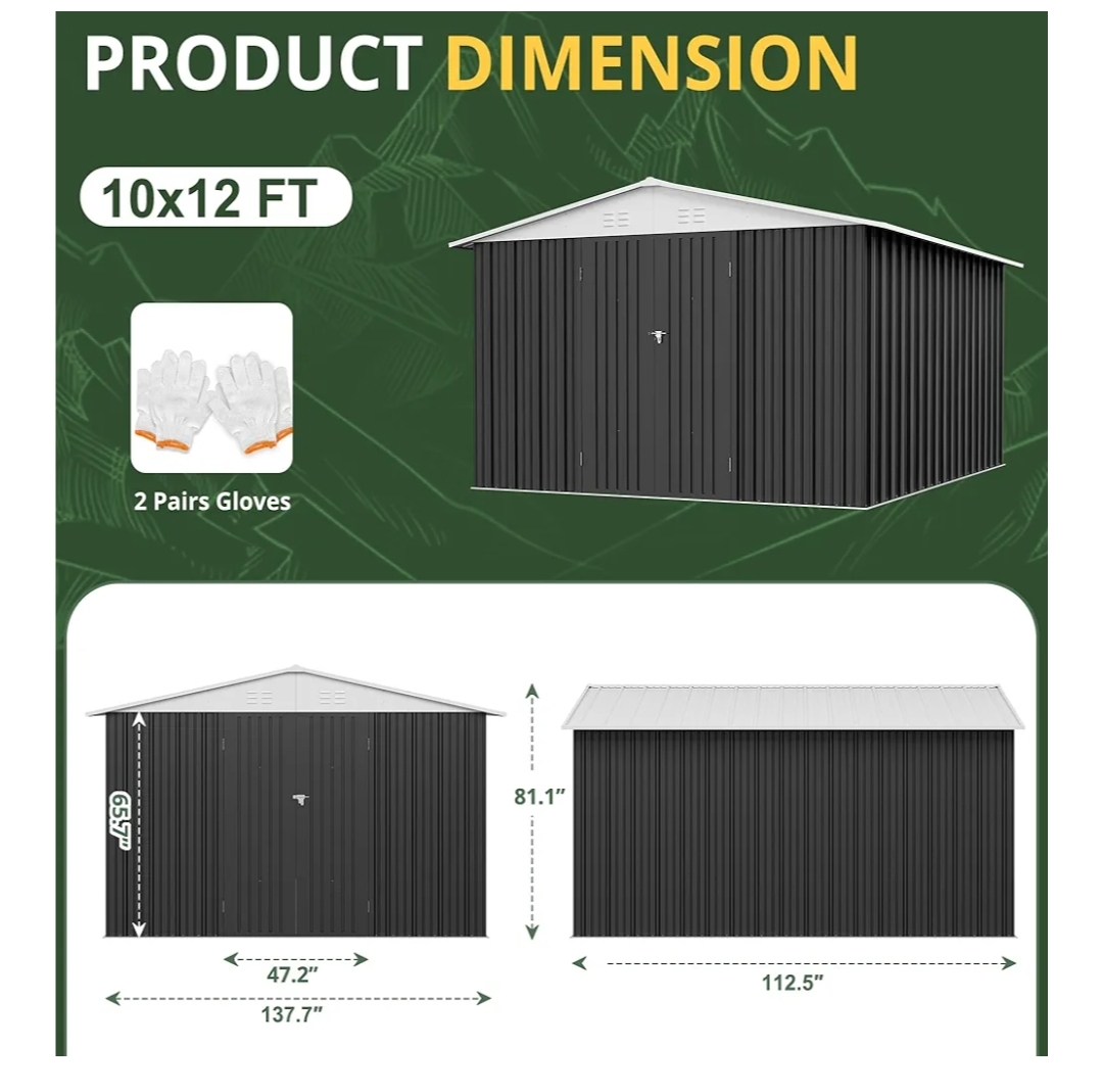 [Distinctive Detailed Design] The 10×12 AIRWIRE garden shed features a lockable door and sloped roof design to protect your outdoor tools from rain and strangers. Four vents in the tool shed provide good air circulation. Each steel plate is covered with a plastic film to protect it, and the sturdy corner guards prevent your skin from getting hurt.