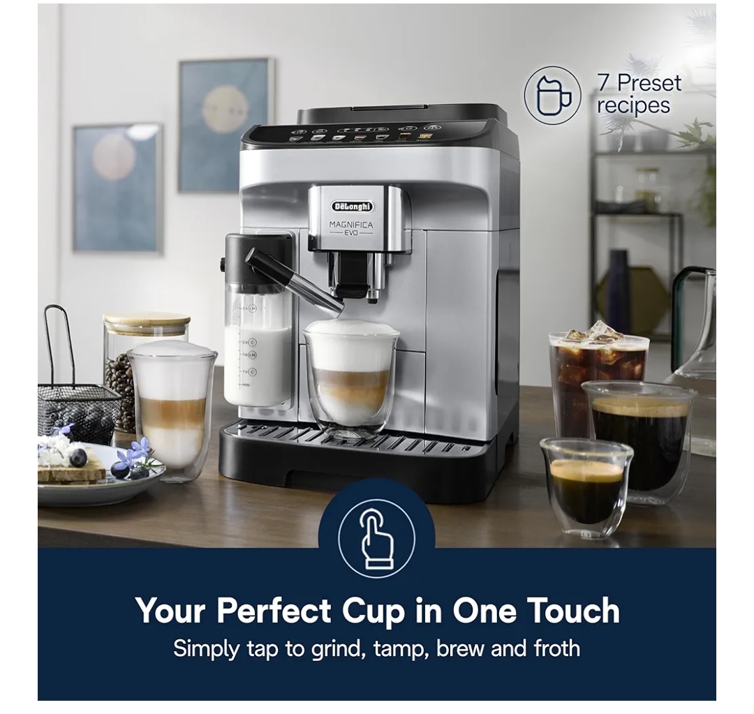 De’Longhi Magnifica Evo Automatic Espresso & Coffee Machine with Auto Milk Frother, Built-in Grinder & Auto-Clean Function – For Latte, Cappuccino, Americano, Iced Coffee, ECAM29084SB , Silver