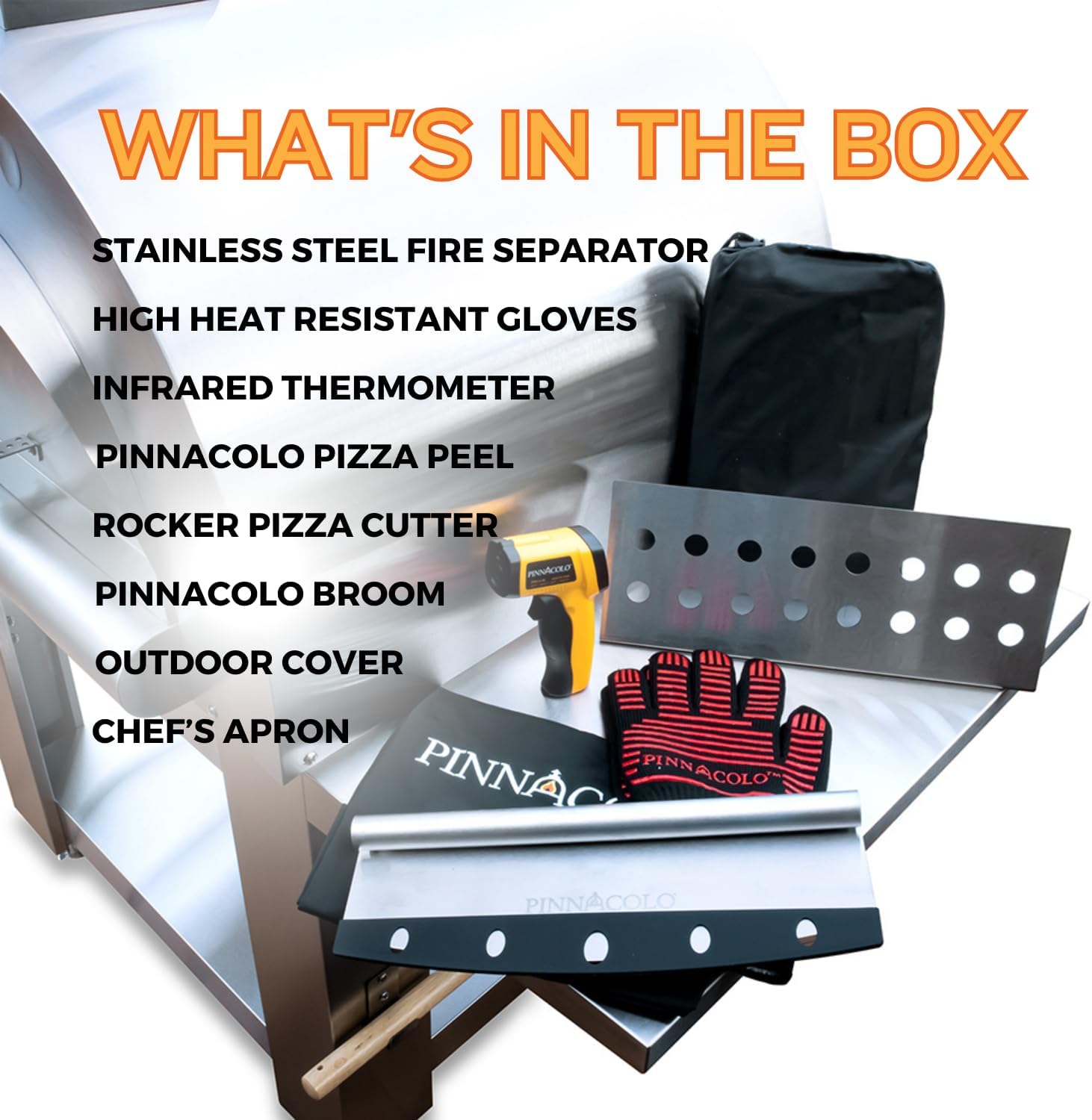 • Accessories Included – 12” perforated peel with Aluminum handle, wire bristle broom with scraper, infrared thermometer, oven gloves, sharpenable pizza cutter, 2x wood pizza peel, weatherproof cover, hose and regular & denim apron.