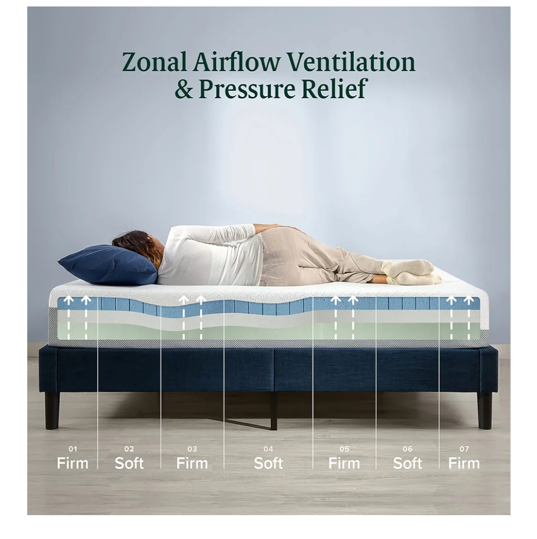 MORE COOLING POWER – A top layer of ultra-cooling gel memory foam paired with our patented 7-zone ventilation system for extra airflow and a stretchable, soft-knit fabric cover with a cool to the touch feeling improves ventilation and offers more air-flow